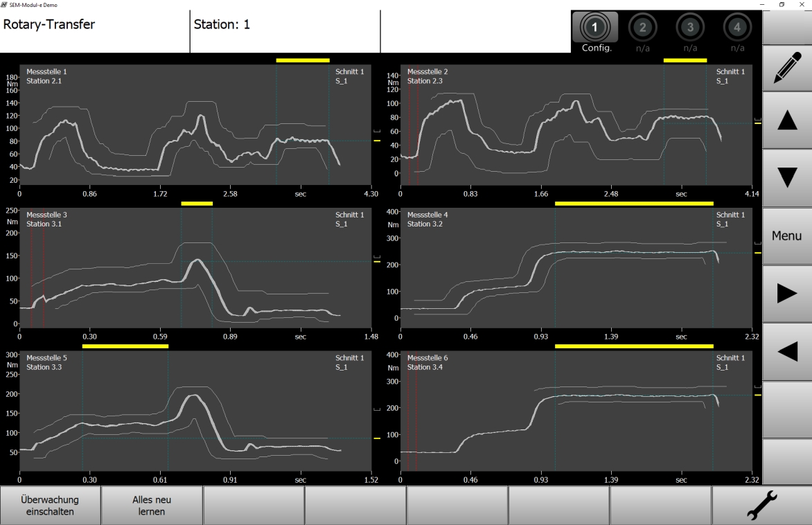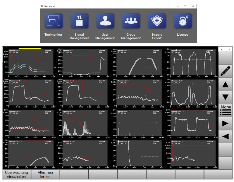 Häufig benötigte Funkionen des Tool Monitors SEM-Modul sind nun bedienerbezogen als Buttons in der Fußzeile des Touchscreens platzierbar. So können beispielsweise nun besonders einfach die Grenzen neu an die letzte Messkurve angepasst, anhand der nächsten Messkurve neu gelernt oder die Überwachung kurz ausgeschaltet werden. Gegen das Vergessen des Wiedereinschaltens der Überwachung kann man eine automatische Zeit vorwählen, nach der sie sich selbsttätig wieder einschaltet. So bleibt die Maschine nicht versehentlich unüberwacht.