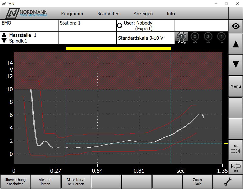 1. Der Bediener muss nicht mehr lernen, wie er eine Hüllkurve partiell grafisch anpasst, auch wenn es per Touchpen am Touchscreen des SEM-Modul sehr einfach geht. Im Fall der Messkurvenanzeige auf einem NC-Bedienfeld steht der Touchscreen meistens nicht zur Verfügung, d. h. die Hüllkurve müsste per Cursortasten korrigiert werden. Das ist nun dank der automatischen Grenzwertkorrektur nicht mehr erforderlich.