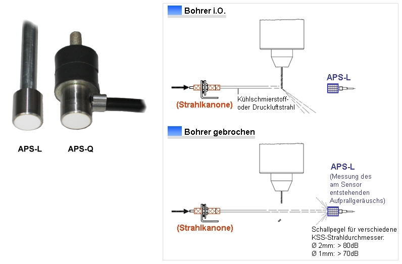 Seinen Einsatzbereich findet der Sensor einerseits bei Mehrspindelbohrköpfen mit Spiralbohrern beliebiger Durchmesser und andererseits bei Kleinstbohrern, die mit anderen Methoden nicht oder nur schwer überwachbar sind.
